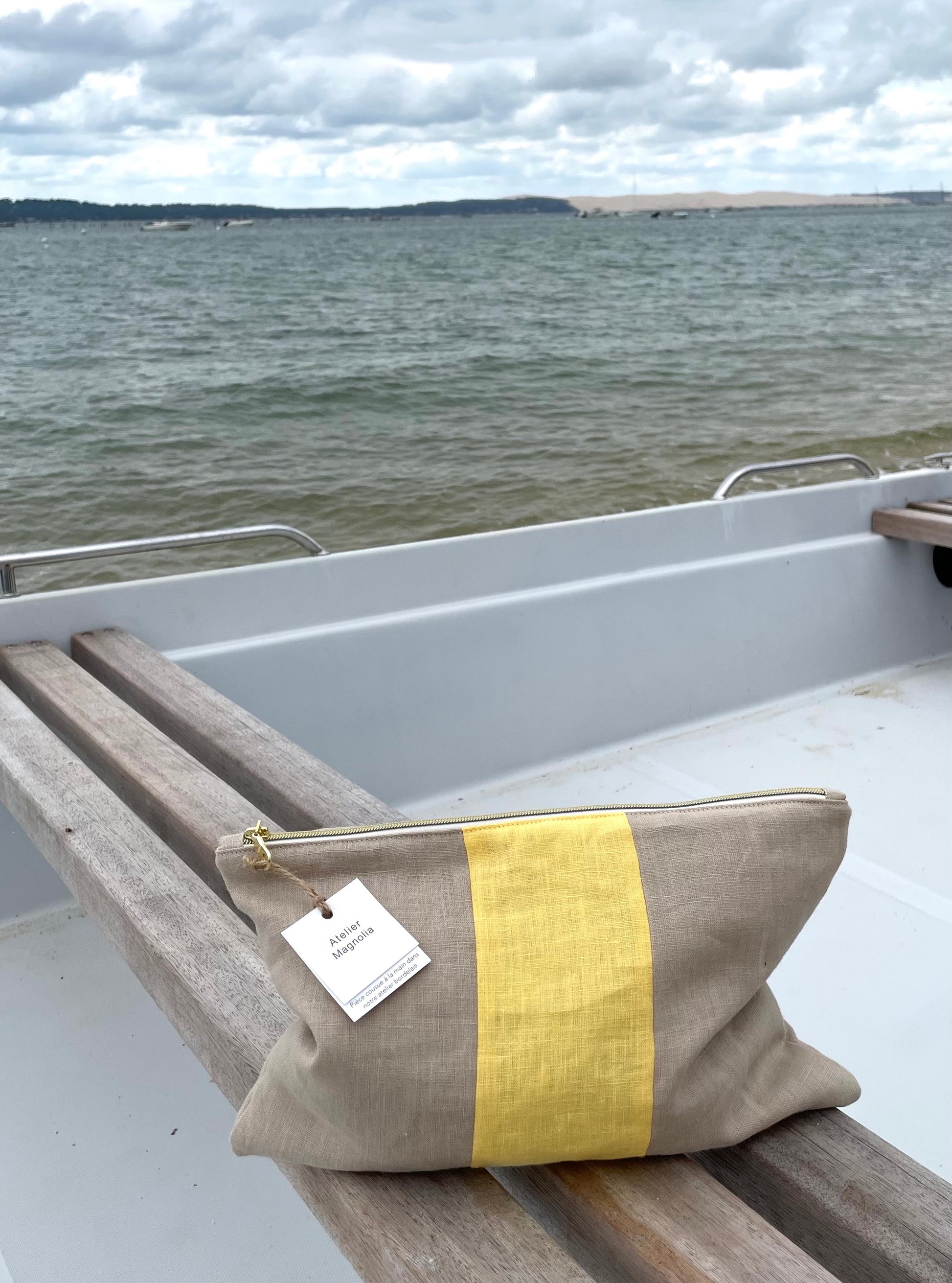 La pochette Camélia est cousue à la main. Chaque rayure est composée à partir de lins soigneusement sélectionnés, puis assemblés bande par bande, véritable signature d'Atelier Magnolia.