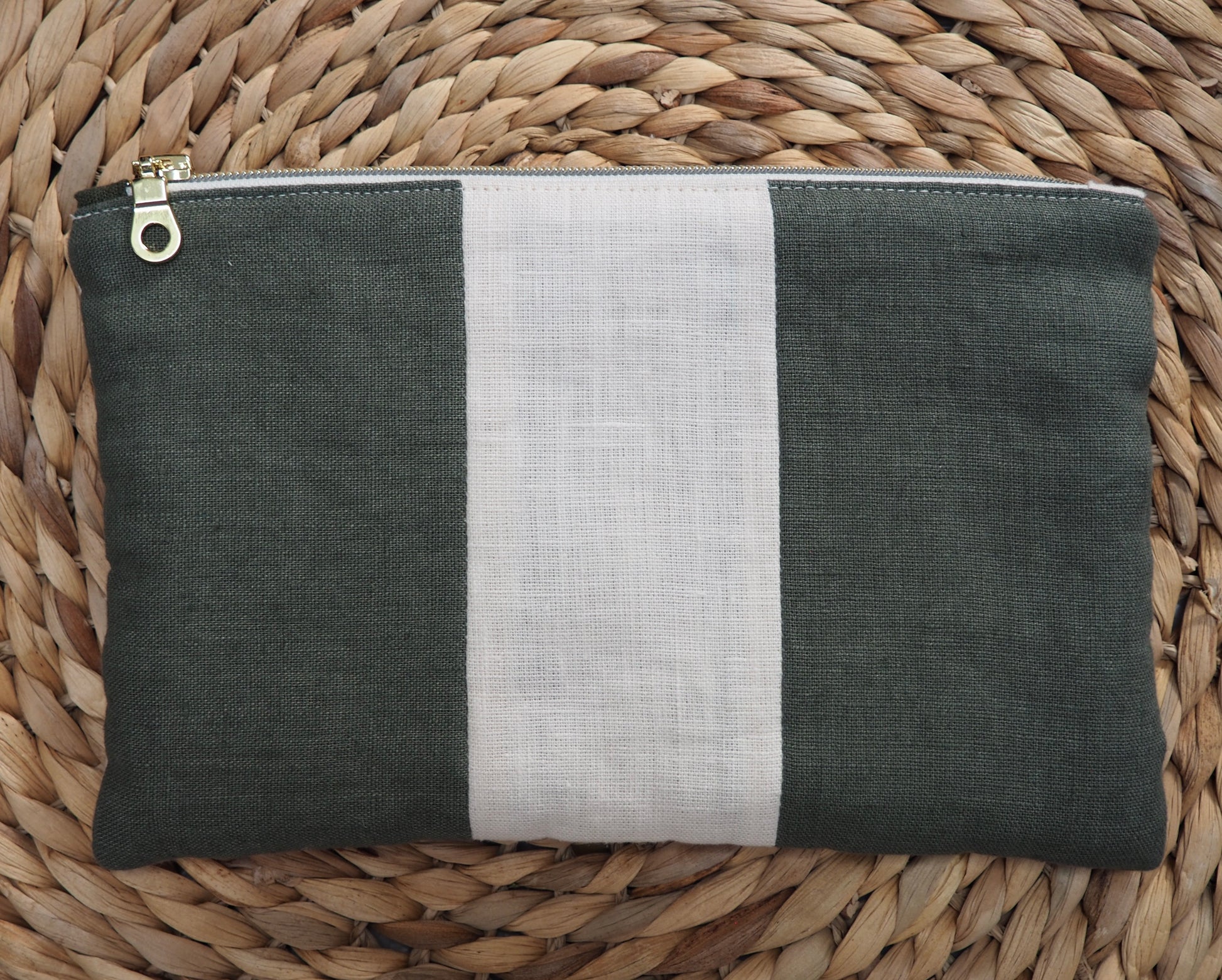 La pochette Camélia est cousue à la main. Chaque rayure est composée à partir de lins soigneusement sélectionnés, puis assemblés bande par bande, véritable signature d'Atelier Magnolia.