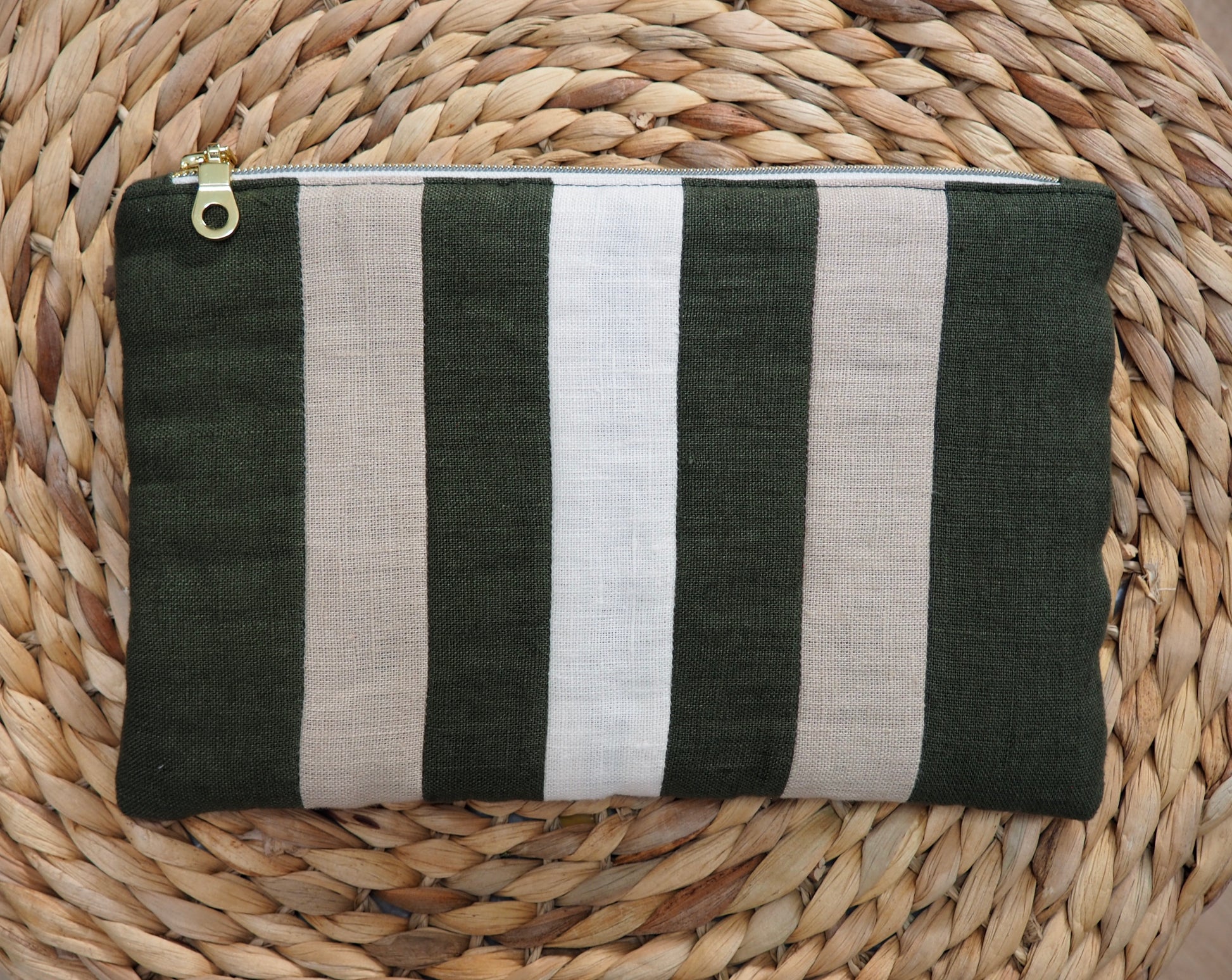La pochette Dahlia est cousue à la main. Chaque rayure est composée à partir de lins soigneusement sélectionnés, puis assemblés bande par bande, véritable signature d'Atelier Magnolia.