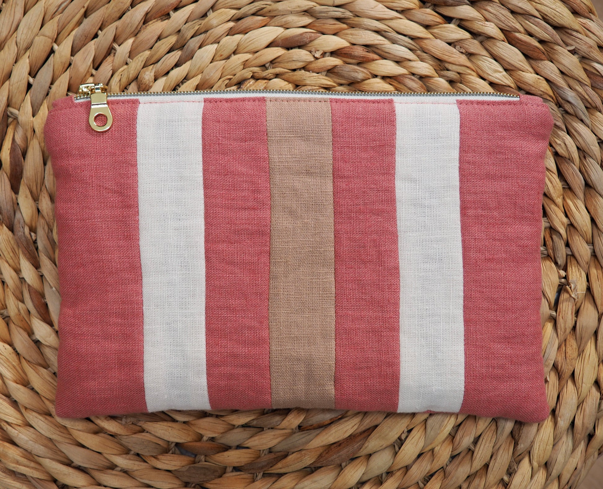 La pochette Dahlia est cousue à la main. Chaque rayure est composée à partir de lins soigneusement sélectionnés, puis assemblés bande par bande, véritable signature d'Atelier Magnolia.