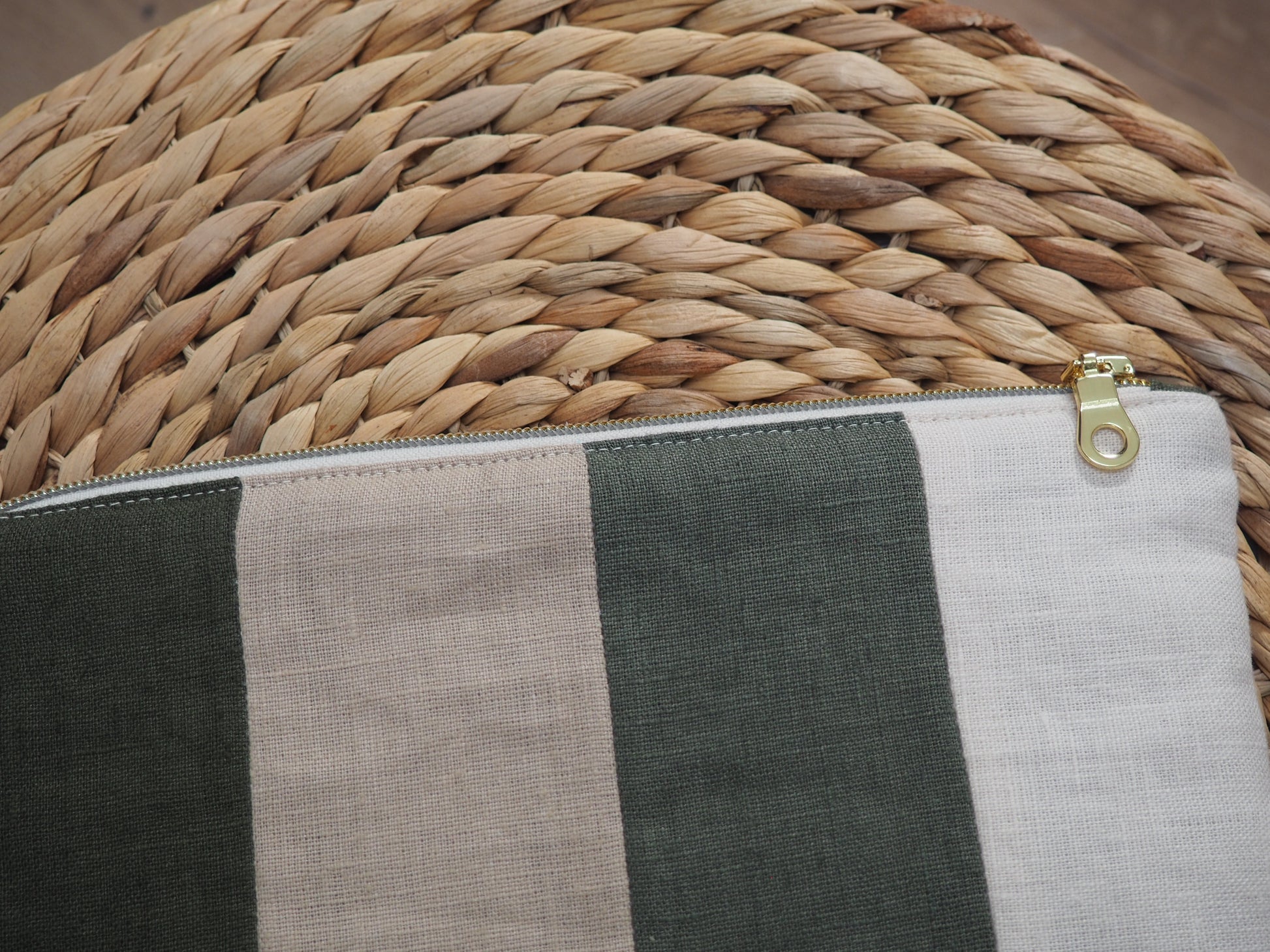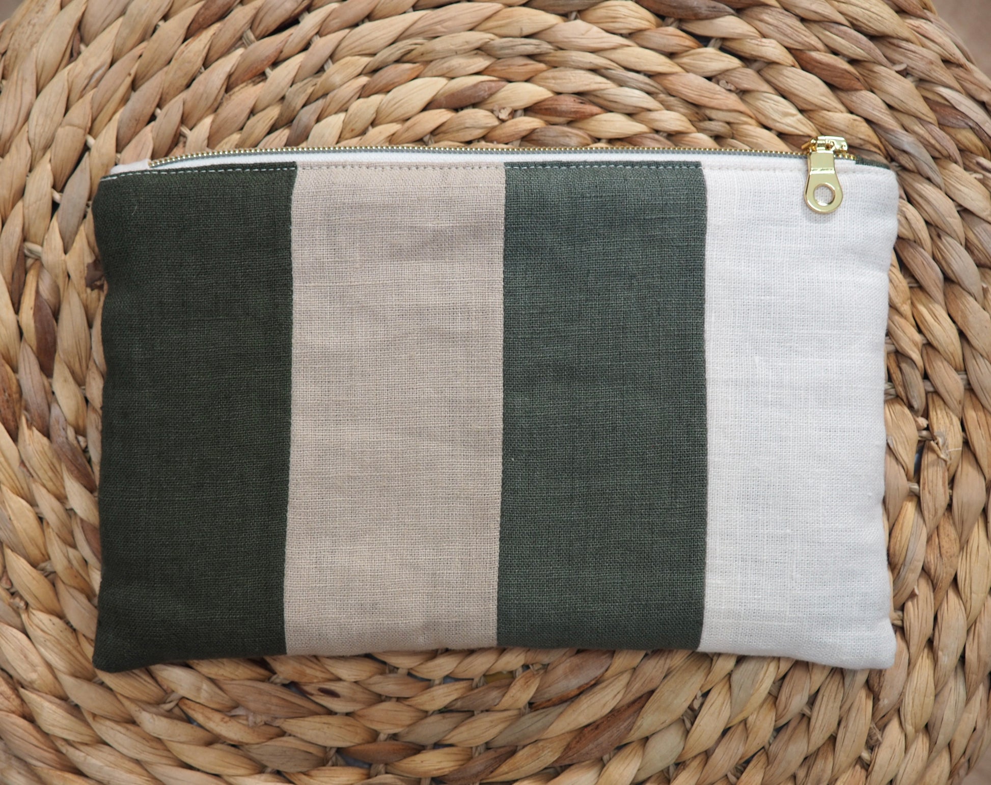 La pochette Pivoine est cousue à la main. Chaque rayure est composée à partir de lins soigneusement sélectionnés, puis assemblés bande par bande, véritable signature d'Atelier Magnolia.