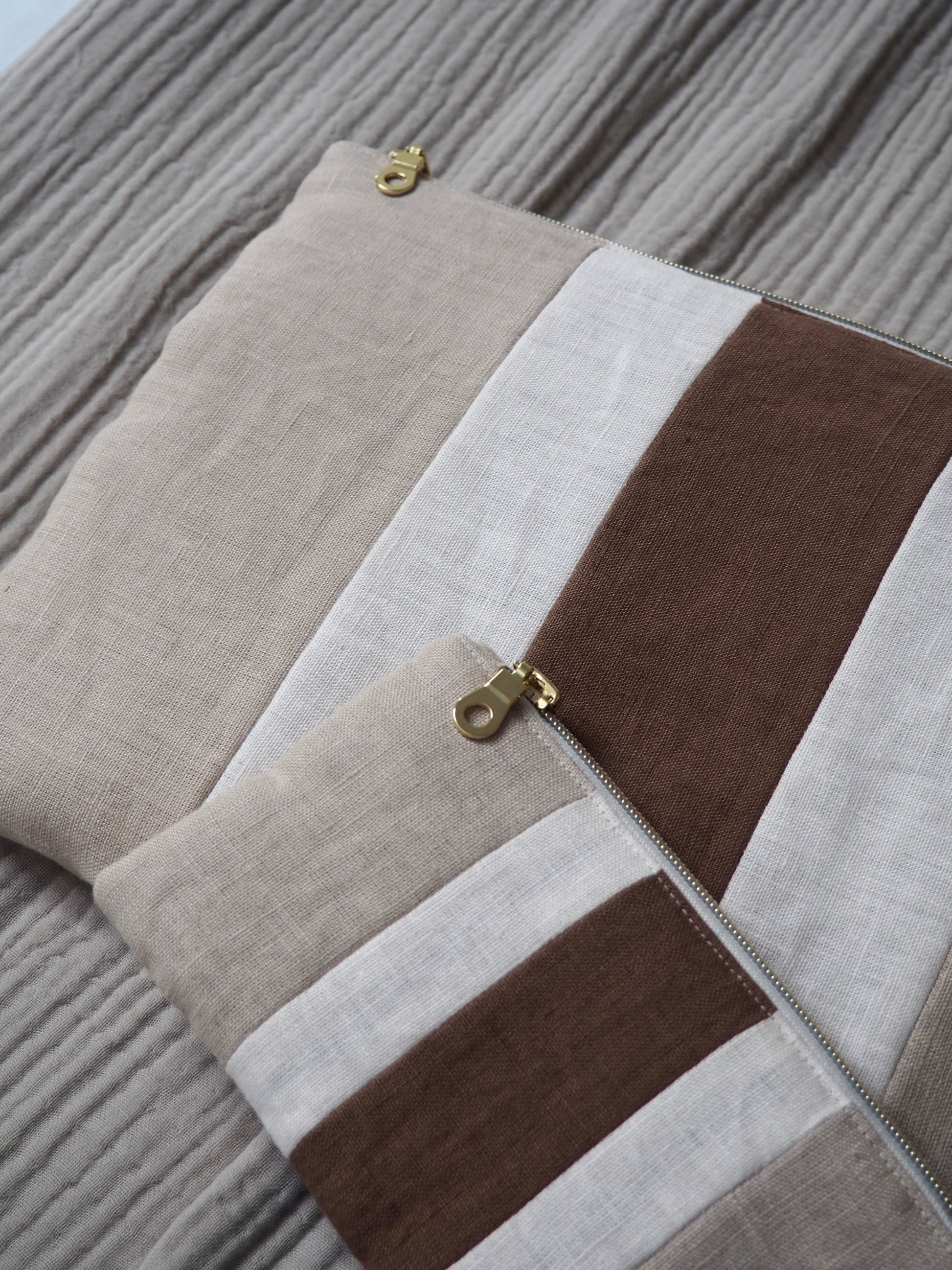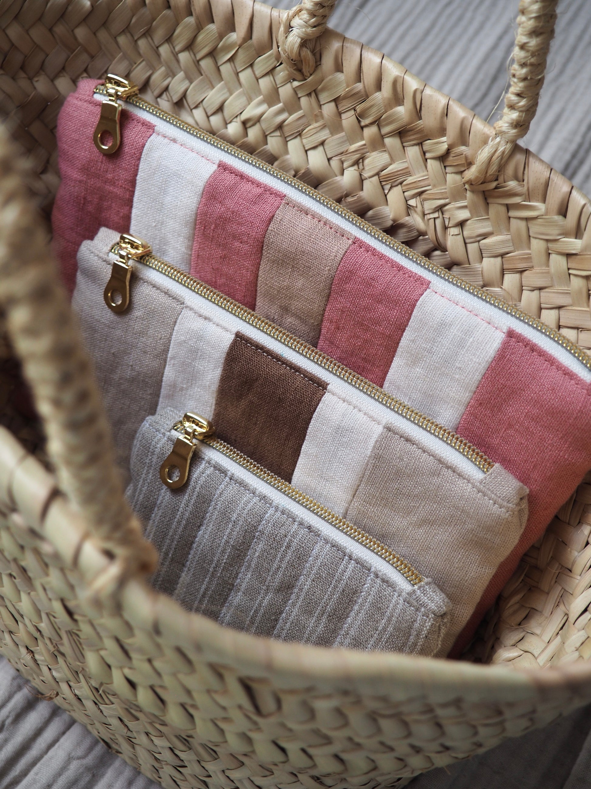 La pochette Rose est cousue à la main. Chaque rayure est composée à partir de lins soigneusement sélectionnés, puis assemblés bande par bande, véritable signature d'Atelier Magnolia.